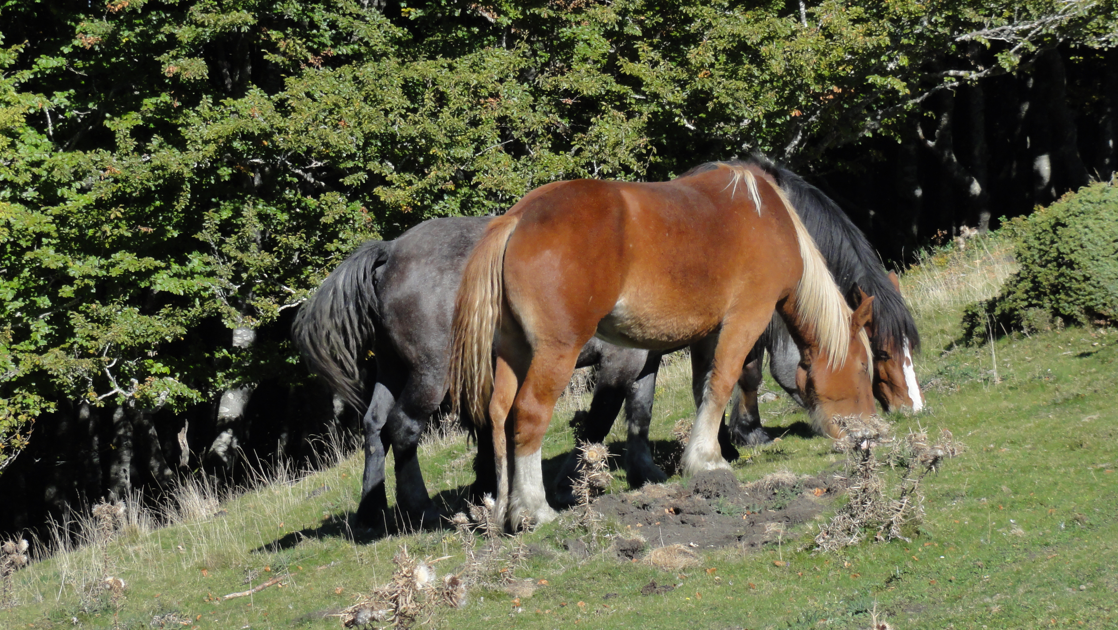 The meat horses look different to riding horses, as they tend to have very broad backs and exceptionally well-muscled rumps, and are in general much heavier – again, like beef cattle compared to dairy cattle. It’s common to come across a few ‘meat horses’ grazing on the mountains or in fields, and they’re often in company with herds of sheep or cattle.