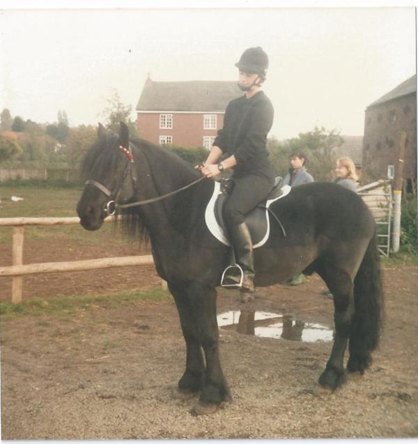 When I got my first pony, Gyp, I’d been riding once a week at a riding school for years, and didn’t ride nearly as well as I thought I did. Gyp was a very well-bred Fell pony, and excelled at Mountain and Moorland showing classes, which quickly became my new passion. Show classes in the eighties required a slightly over-weight horse, and a rider who smiled manically at the judge all the time. Manic smiling made my cheeks hurt, but I quickly got the hang of ‘show riding’ – i.e. sitting up tall with my shoulders back – unfortunately, this made me arch my lower back and severely weakened my leg position. I’m now going to be very brave and show you a picture of me during this period – pretty awful, and that’s not mentioning the fact that I was clearly going through a goth period – well, it was 1985.