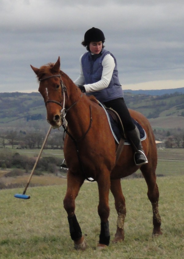 Here’s a more recent pic of me learning to play polo in France, earlier this year. Allowing for the fact that I’m rubbish at polo (no eye/hand co-ordination), and I’m concentrating very hard on something that isn’t the horse, you can see that my leg position is much stronger, with a level foot and no turning out of the toes.