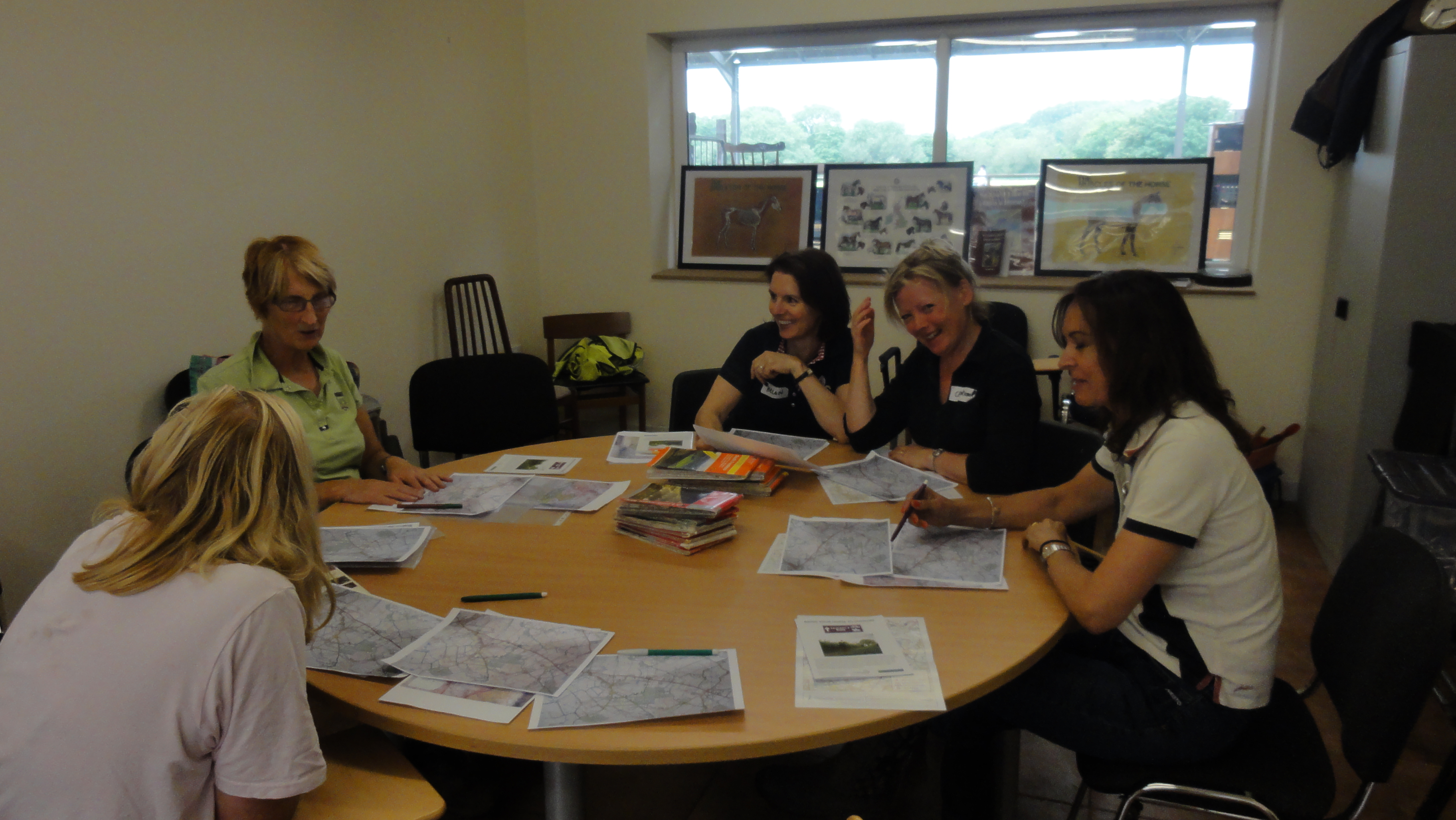 Laureen handed out some maps, and we all marked the route. This practice exercise was to take place on foot rather than mounted, as it involved crossing a very busy A road. Laureen took us through the proposed route, pointing out an orchard, marshy area and buildings, as well as the points where we should expect to cross a road or track, then we set off in pairs.