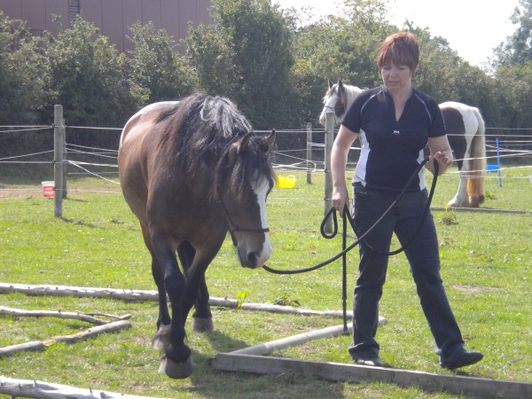 The next challenge was a ‘bridge’, made from tarpaulin laid taut between two jump poles. I thought that Blue would try to jump it, but she showed no inclination at all. She stood quietly and watched Trigger the Shetland walk backwards and forwards several times, and was then happy to walk right up to it. When I asked her to go forwards and place a foot on the tarpaulin, she retreated, but was happy to step up again without panicking. Eventually, she stood with her head hanging over the tarpaulin and her feet still in the arena. Dawn was pleased with this, as it showed that she was comfortable with exposing vulnerable areas to the obstacle. Gradually, she put a foot onto the ‘bridge’ and immediately withdrew it. I allowed her to retreat, as per Dawn’s instructions, before asking again, and waiting until she wanted to move forwards of her own accord. Suddenly, she decided to take the plunge, and moved smoothly over the obstacle. I immediately led her round and over again, and we repeated several more times in each direction until she was moving without hesitation.
